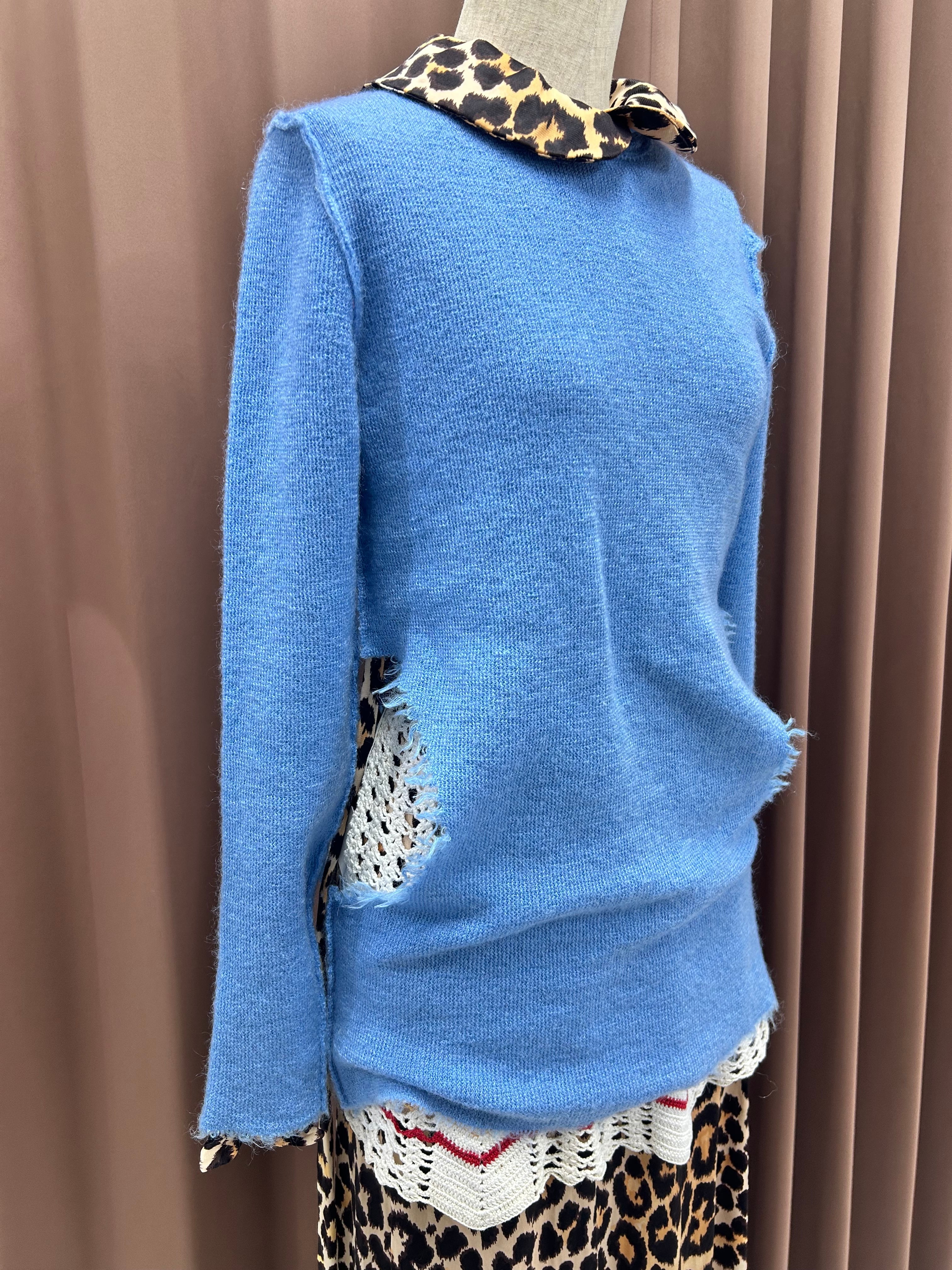 サイドの大胆なダメージホールの開きがユニークさ引き立ててくれる一着。