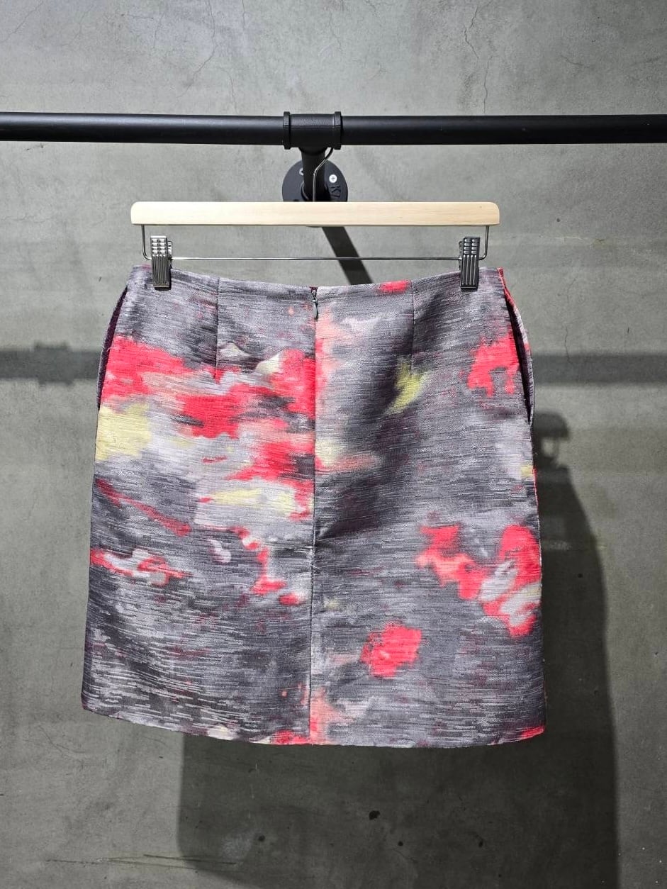 光沢感のある生地に、絵画のようなアートな総柄が施されたスカートです。